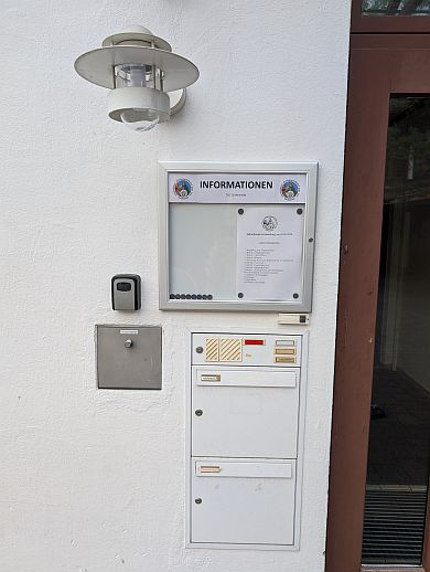 ein Info-Schaukasten links neben dem Eingang. Hier werden